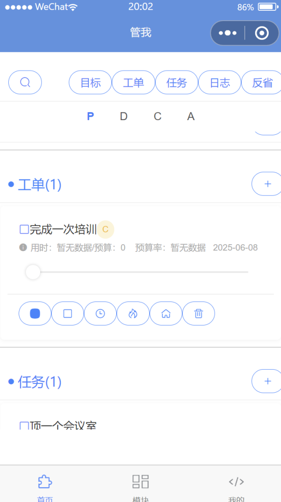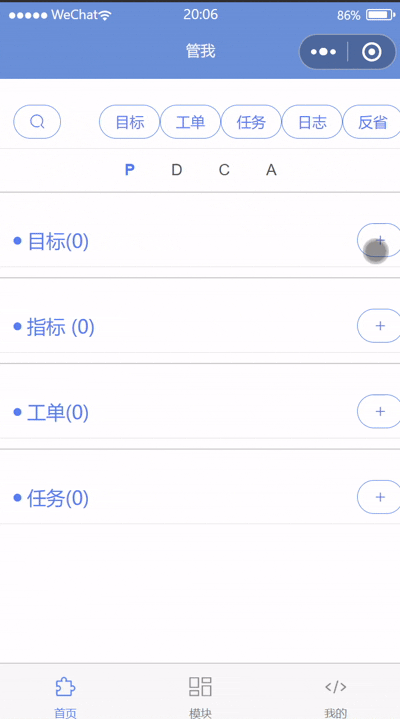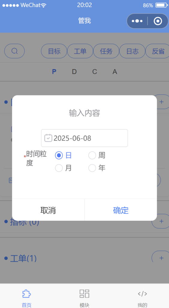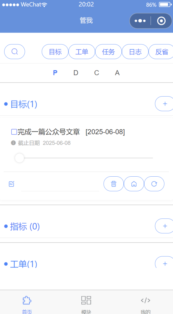 计划管理模块放在首页。可以做日、周、月、年不同时间粒度的计划,通过新增目标、工单、任务,确定计划。后续实施种可以记录日志,结束时可以进行反省,形成闭环。