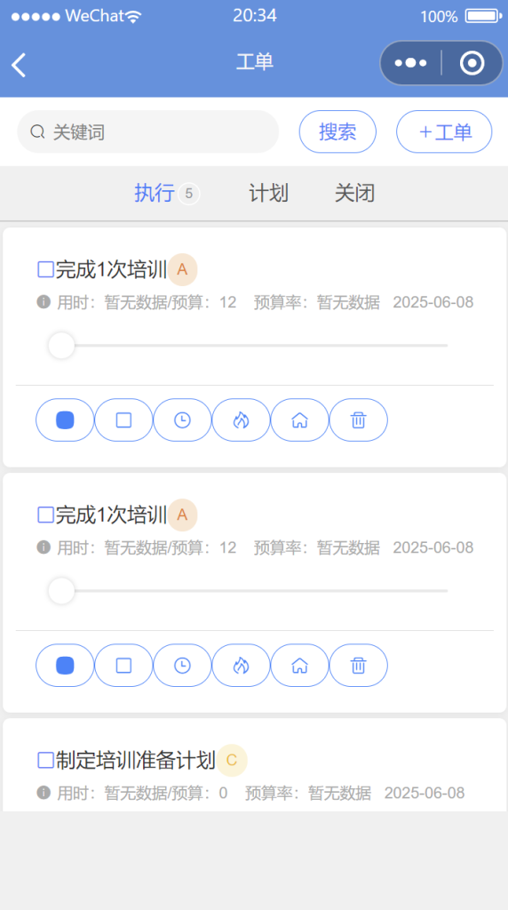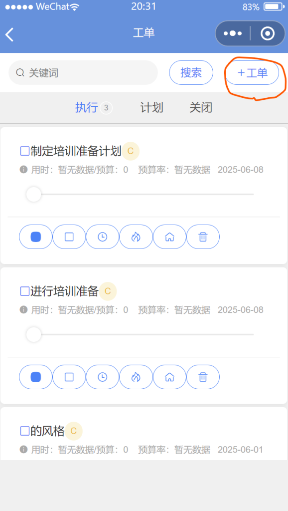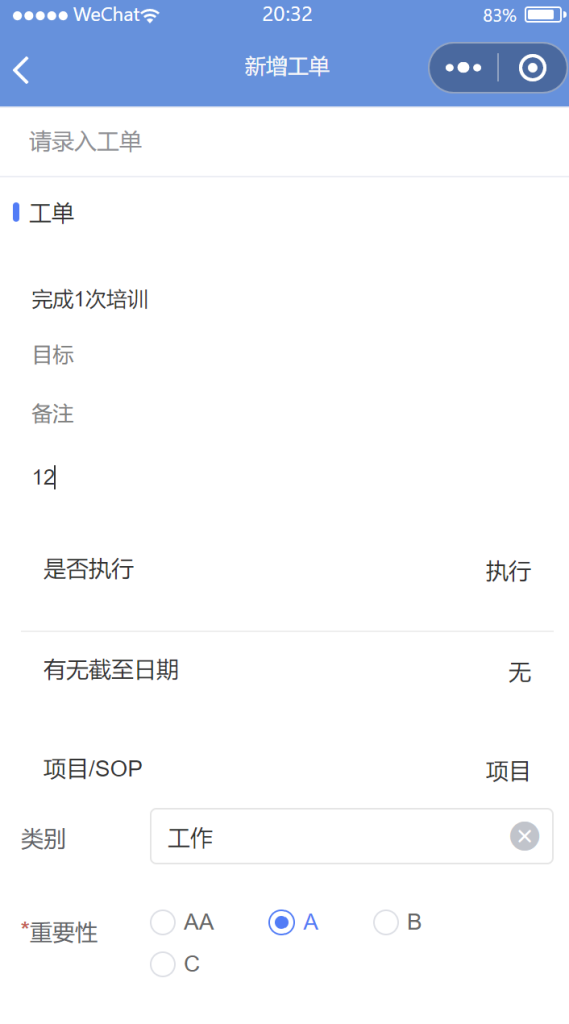 工作包括工单和任务2个模块。工单包括项目和标准操作2种类型。用户可以录入工单,可以填写类别、预算时间、重要性,是否执行。工单录入后,可以使用日志、决策等各种组件。